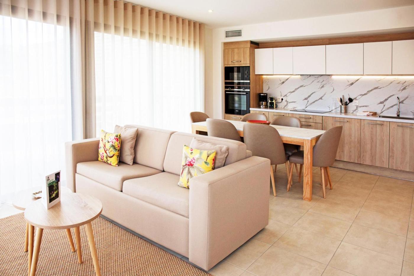 Two-Bedroom Apartment with Air conditioning and Balcony (6 People). This spacious apartment is comprised of 1 living room, 2 separate bedrooms and 1 bathroom with a hairdryer. Guests can make meals in the kitchen that is fitted with a stovetop, a refrigerator, a dishwasher and kitchenware. This apartment is air-conditioned and features a seating area with a flat-screen TV, a washing machine, a dining area, a wardrobe, as well as a safe deposit box. The unit offers 4 beds. ;