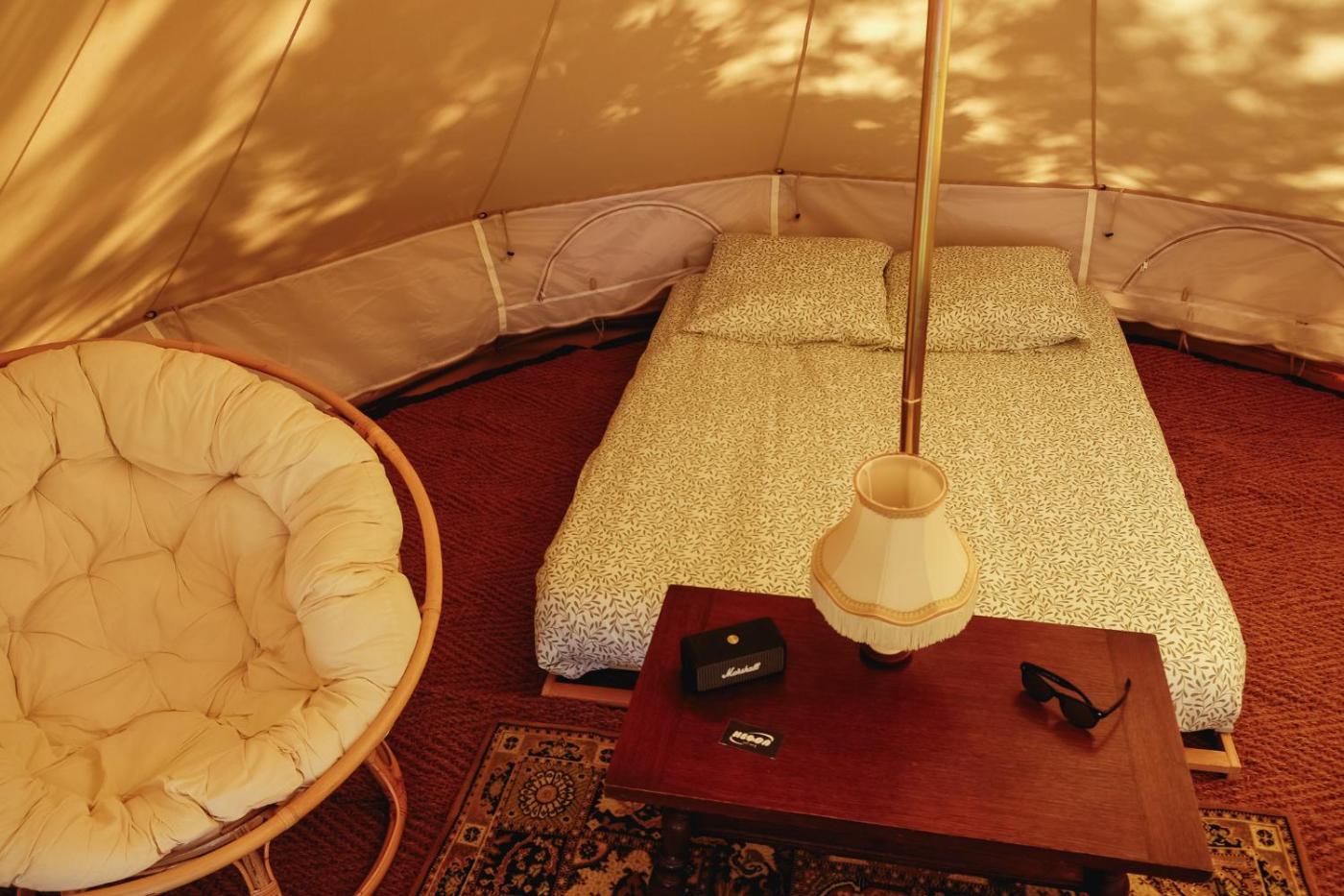 Tent. This tents standout feature is the hot tub. The tent offers a wardrobe, as well as a shared bathroom featuring a shower. Guests will find a stovetop, a refrigerator, kitchenware and a microwave in the well-equipped kitchen. The tent also has a barbecue. Among the room amenities are a washing machine, a coffee machine, a dining area as well as an outdoor dining area and garden views. The unit offers 1 bed.